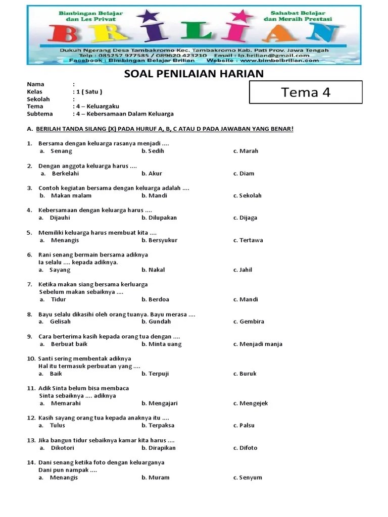 Soal Tematik Kelas 1 Tema 5 Subtema 4 Bimbel Brilian : Pin Di Soal Ulangan Sd - Soal tematik kelas 2 subtema 4.